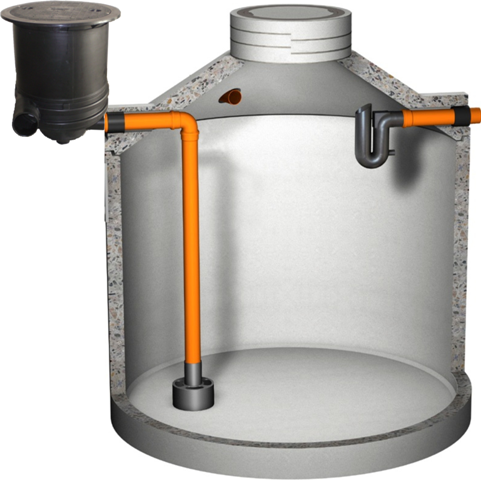 begehbar, Wasserausbeute 95%. Auch als Sandseparator geeignet. Höhenversatz 210 mm zwischen Zu und Ablauf zum Tank. Zulauf DN 150, Ablauf zum Regenwasserspeicher